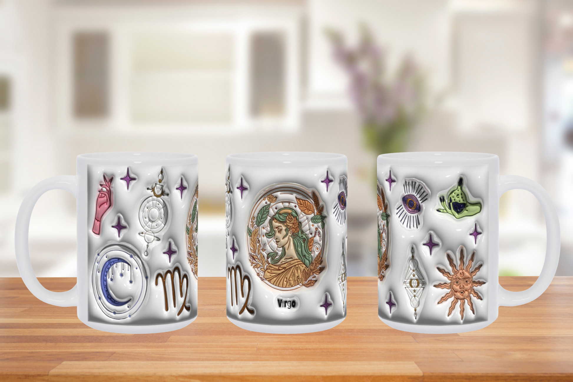 Introducing our unique 'Inflated' Zodiac Sign Mugs collection - a celestial journey captured in the coziness of your daily coffee ritual. Each mug in this enchanting series is dedicated to one of the twelve Zodiac signs, bringing the essence of astrology right to your fingertips. Crafted with an innovative design technique, these mugs feature a flat print that magically evokes a 'puffy' finish, creating an illusion of depth and texture that is both visually intriguing and delightfully tactile.