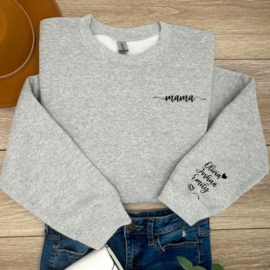 What sets this sweatshirt apart is the personalized touch that celebrates the unique bond between a mother and her children. Choose to have "Mama", "Mammy", "Mam", "Mom", "Mommy" or "Mum" elegantly embroidered on the left chest, reflecting your preferred title. The left sleeve comes alive with the names of her children, embroidered alongside charming hearts, all in a striking black text. This custom feature adds a layer of personal significance, making it not just a garment, but a cherished keepsake.